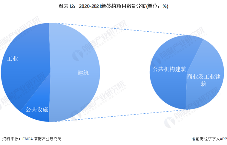 EMCA抽样调查了1419个2020-2021年新签约合同能源管理项目,从分布领域来看,工业领域项目数量为554个,占比39%;建筑领域项目数量为723个,占比51%,公共设施领域4项目数量为142个,占比10%。建筑项目数量进一步上升,占比首次超过50%。