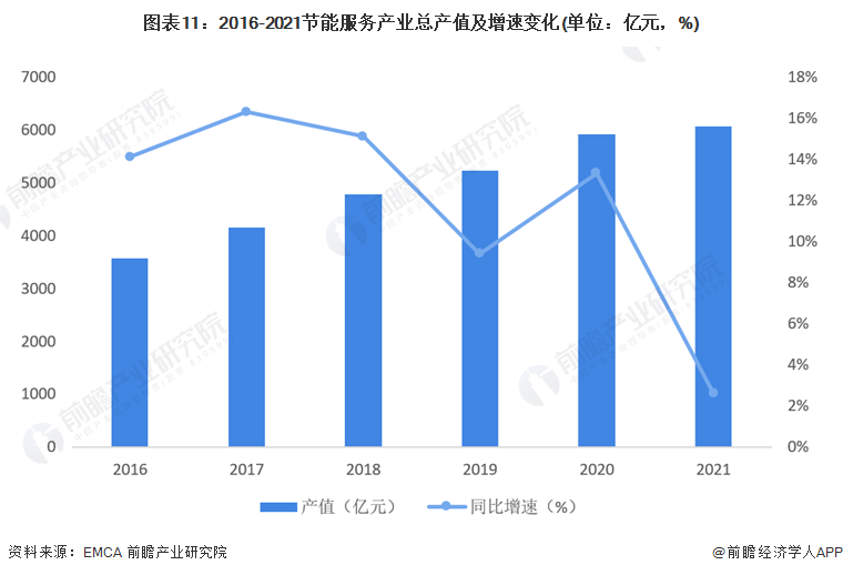 根据《2021节能服务产业发展报告》,在“双碳”战略的推动下,我国节能服务产业新增从业主体显著增多,成为绿色就业的重要驱动力,企业总资产持续增加但盈利能力趋降,产业规模稳中有升,2021年产业总产值同比增加2.6%,达到6069亿元。