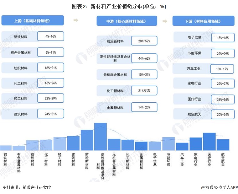 新材料产业上游为基础材料,包括钢铁材料、有色金属材料、纺织材料、化工材料、轻工材料和建筑材料等。新材料产业中游为新材料,根据国家《新材料产业指南》划分,细分领域包括先进基础材料(先进钢铁材料、先进有色金属、先进化工材料、先进建筑材料、先进轻纺材料)、关键战略材料(高端装备用特种合金、高性能分离膜材料、高性能纤维及复合材料等)和前沿新材料(石墨烯、金属及高分子增材制造材料、形状记忆合金、自修复材、智能仿生与超材料等);根据新材料核心应用,新材料可包括前沿新材料、高性能纤维及复合材料、无机非金属材料、化工新材料和金属新材料。新材料产业下游应用范围十分广泛,包括电子信息、汽车工业、家电、医疗、节能环保、航空航天、化工产业等。