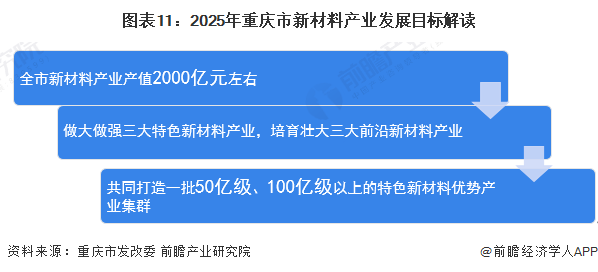 根据2022年12月重庆市发改委出台的《重庆市材料工业高质量发展“十四五”规划》,“十四五”期间,做大做强三大特色新材料产业,培育壮大三大前沿新材料产业,打造一批50亿级、100亿级以上的特色新材料优势产业集群。至2025年,全市新材料产业产值2000亿元左右。