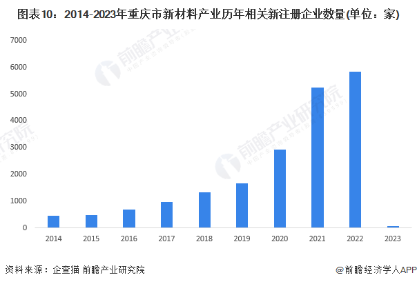 根据企查猫查询数据显示,近年来新材料历年新注册企业数量也快速增长。截至2023年1月10日,重庆新材料产业相关的注册企业超2万家,其中2021年新注册企业数量创历史高峰,达5810家,表明重庆新材料产业的发展热潮未减。