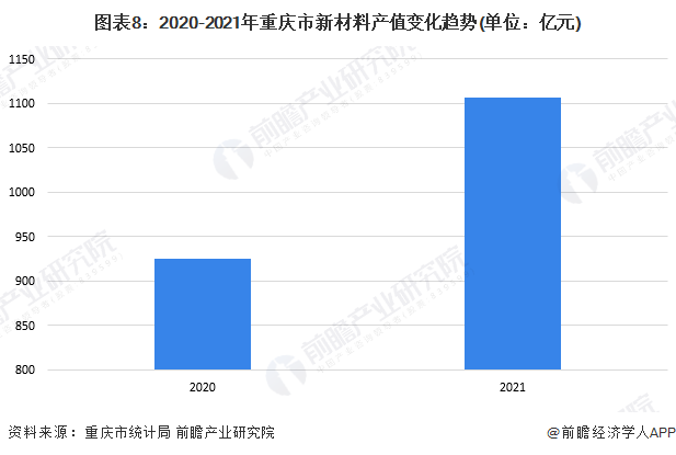 从重庆市新材料产业的发展方向来看,重点发展先进金属材料、新型非金属材料、化工合成材料、精细化工等产品,加快培育前沿新材料,构建先进基础材料、关键战略材料和前沿新材料协同发展格局;形成核心竞争力突出的5大新材料产业基地。根据重庆工信部数据显示,2020年,重庆市新材料产值为925.15亿元。2021年,重庆市新材料产值同比增加19%,突破千亿元。