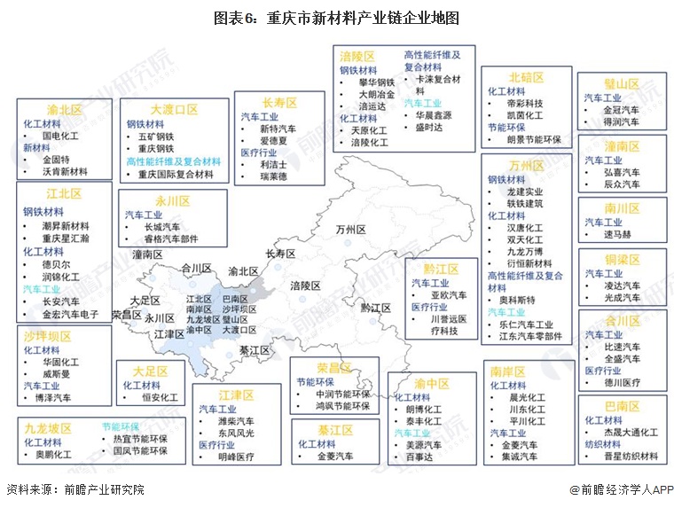在政策指引和市场需求的驱动下,重庆市新材料产业链不断完善,其中,在电子信息、新材料服务、无机非金属材料、化工材料及新材料及配套市场环节均有企业布局: