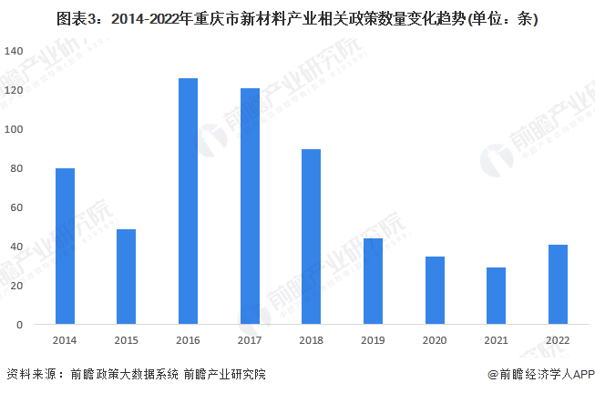 作为全国新材料发展领先城市,“十一五”以来,重庆就颁布实施了多项行动方案促进新材料的发展;“十四五”时期,新一轮科技革命和产业变革加速演进、新发展格局加快构建、成渝地区双城经济圈建设加快推进,为重庆市新材料高质量发展注入了新的动力。2014-2022年,重庆每年均制定了新材料制造的支持政策,鼓励和支持新材料在各个领域的应用;2022年12月,重庆出台《重庆市材料工业高质量发展“十四五”规划》,其中明确提出了“十四五”期间的发展目标;2022年,重庆市共有41条相关政策公布。