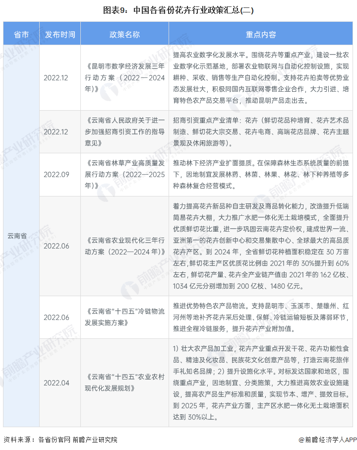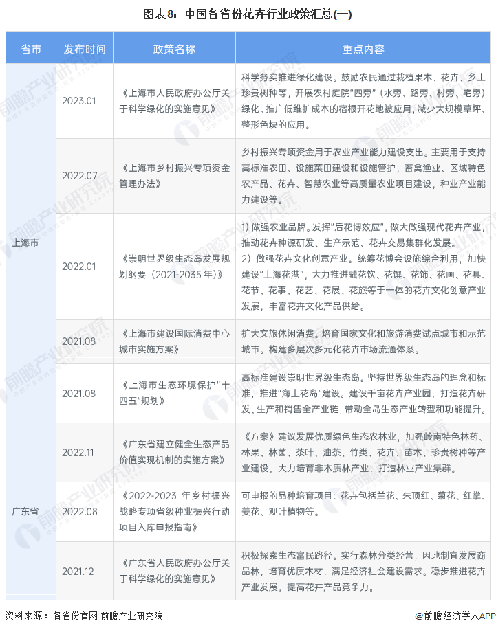 “十四五”时期,我国花卉行业将增强生产能力,加强大中型、智能化、复合型农业机械研发应用,加强种质资源保护利用和种子库建设,加强农业良种技术攻关,有序推进生物育种产业化应用,培育具有国际竞争力的种业龙头企业;深化结构调整,积极发展设施农业,因地制宜发展花卉种植业,农业绿色转型,加强产地环境保护治理。在此基础上,各省市也围绕相关规范性政策,纷纷出台地方花卉产业发展政策规划。
