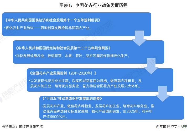 花卉行业是农业发展的组成部分,但其并非关系到我国国计民生的重点行业,因此,花卉行业的针对性政策数量相对较少。“十一五”规划中首次提到因地制宜发展经济林和花卉产业。“十二五”时期,国家强调加快发展设施农业,推进茶叶、花卉等园艺作物标准化生产。2013年,国家林业局正式发布了《全国花卉产业发展规划(2011-2020年)》,明确做强花卉种植业,发展花卉加工业,培育花卉服务业。