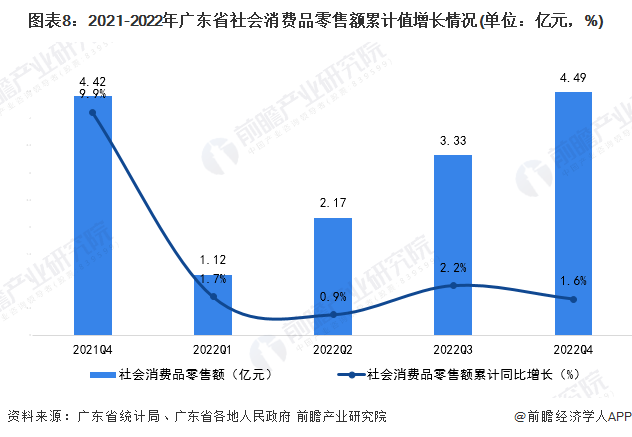 2022年,广东实现社会消费品零售总额4.49万亿元,同比增长1.6%。按经营单位所在地分,城镇市场消费品零售额增长0.9%,乡村市场增长6.3%。按消费形态分,商品零售增长2.3%,其中,限额以上单位汽车类商品零售额增长4.9%,石油及其制品类增长11.1%,通讯器材类增长9.9%。基本生活用品类和中西药品类消费保持稳步增长,其中,粮油食品类、饮料类、中西药品类商品零售额分别增长9.0%、5.6%和12.1%。餐饮收入下降4.3%。