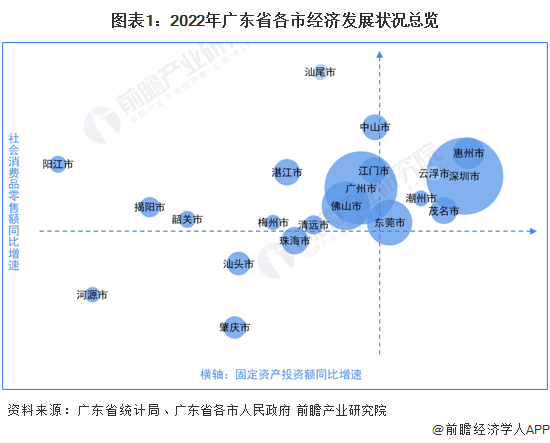 2022年,广东坚持稳中求进工作总基调,高效统筹疫情防控和经济社会发展,有力有效应对超预期因素冲击,经济运行韧性彰显,高质量发展取得新的成效,民生保障持续加强,经济社会大局保持稳定。从广东省各市经济发展状况来看,深圳市、广州市和佛山市GDP规模排名全市前三;惠州市全年固定资产投资增速最快、阳江市固定资产投资降幅最大;社会消费水平方面,汕尾市社会消费品零售额增速最快,而肇庆市社会消费品零售额降幅最大。