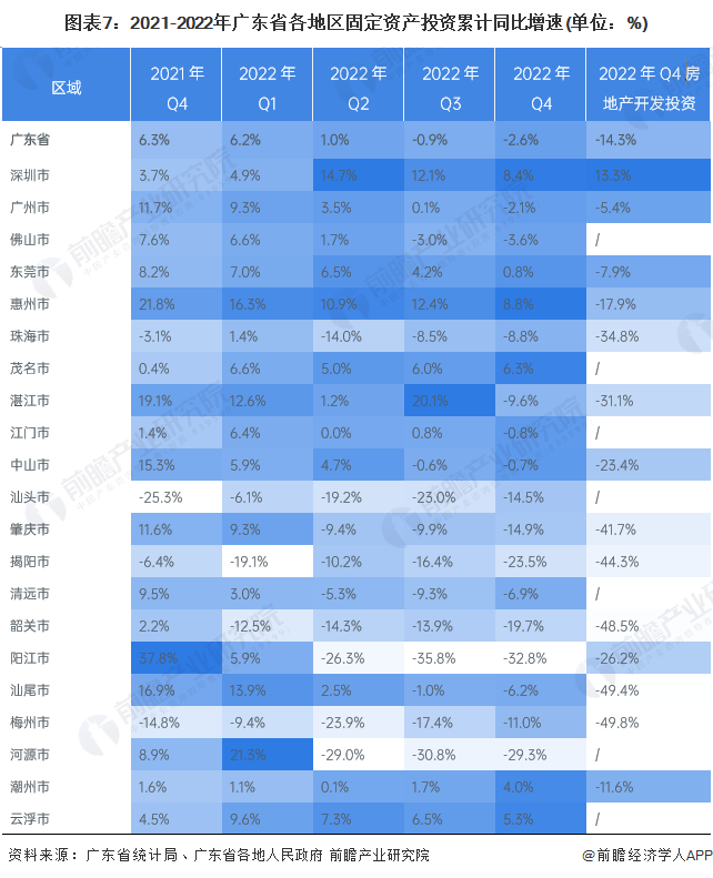 2022年全年,广东省固定资产投资同比下降2.6%。分地区来看,惠州市固定资产投资增速最快,达8.8%;阳江市固定资产投资增速最低,为-32.8%。此外,固定资产投资增速在6%以上的深圳市和茂名市。
