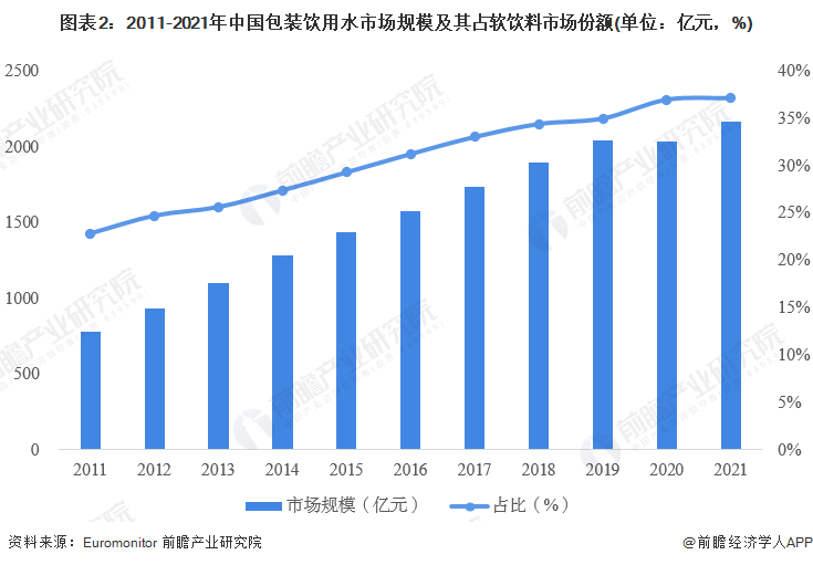 包装饮用水使用场景丰富,除日常饮用外,可从做饭、煲汤等细分场景替代自来水。我国包装饮用水发展阶段处于中前期阶段,行业仍不断扩容。2011-2021年,包装饮用水市场规模不断扩大,在软饮料行业的占比不断提高。2021年,包装饮用水零售市场规模为2163.66亿元,市占率为37.12%。