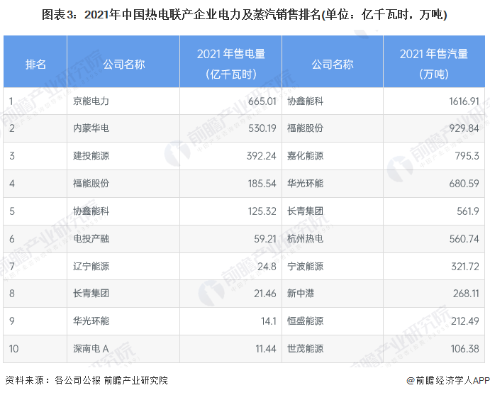 2、中国热电联产行业电力及蒸汽销量排名
