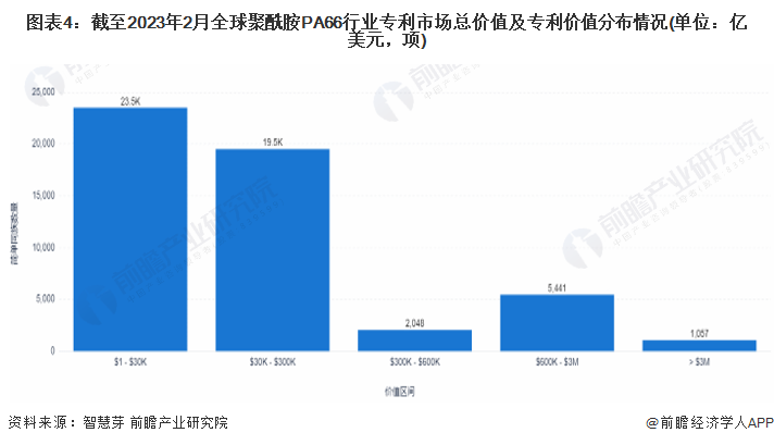 目前,全球聚酰胺PA66行业专利总价值为152.9亿美元。其中,3万美元以下的聚酰胺PA66专利申请数量最多,为2.35万项;其次是3万-30万美元的聚酰胺PA66专利,合计专利申请量为1.95万项。3百万美元以上的聚酰胺PA66专利申请数量最少,为1057项。