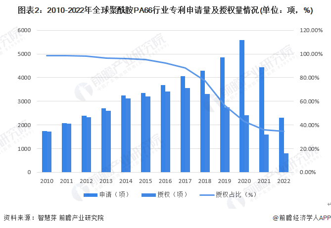 2010-2020年全球聚酰胺PA66行业专利申请数量呈现增长态势,2021年全球聚酰胺PA66行业专利申请数量有所下降,2022年全球聚酰胺PA66行业专利申请数量为2295项。在专利授权方面,2010-2018年全球聚酰胺PA66行业专利授权数量逐年增长,2019年开始出现下降趋势,2022年全球聚酰胺PA66行业专利授权数量为791项,授权比重为34.47%。