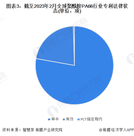 目前,全球聚酰胺PA66大多数专利处于“有效”状态,专利总量为4.13万项,占全球聚酰胺PA66专利总量的77.79%。“审中”状态的聚酰胺PA66专利数量为1.15万项,占全球聚酰胺PA66专利总量的21.74%。