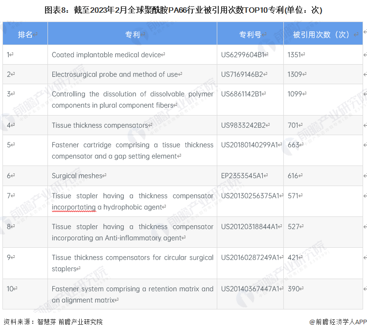 Coated implantable medical device(专利号:US6299604B1)和Electrosurgical probe and method of use(专利号:US7169146B2)是被引用次数最多的两大聚酰胺PA66专利,两者被引用次数均超过1300次。其它被引用次数前十大专利如下所示: