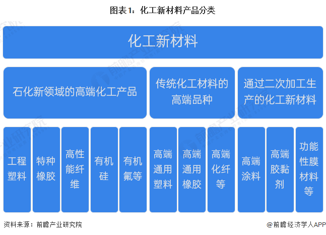 按照工业类别进行划分,化工新材料主要包括三大类:一是新领域的高端化工产品,二是传统化工材料的高端品种,三是通过二次加工生产的化工新材料。主要包括工程塑料、功能高分子材料、有机硅、有机氟、特种纤维、复合材料、电子化工材料、纳米化工材料、特种橡胶、聚氨酯、高性能聚烯烃、特种涂料、特种胶黏剂、特种助剂等十多个大类品种。