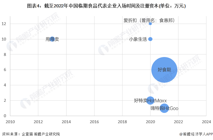 从我国临期食品代表企业入场时间来看,主要集中在2020-2021年,其中,注册资本最大的为好食期(上海多维度网络科技股份有限公司旗下平台),企业规模约6970万元。