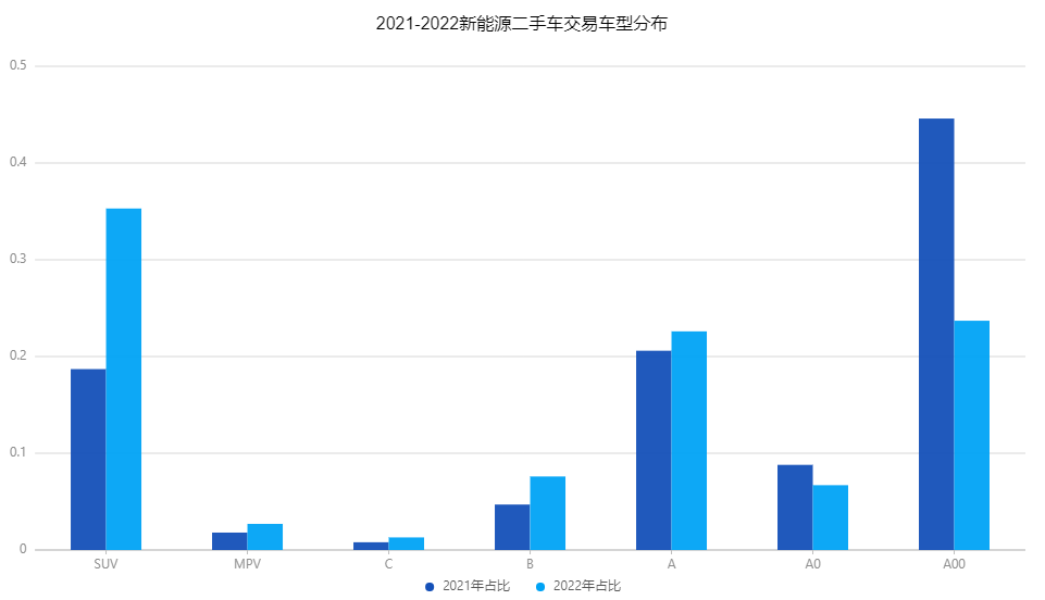 从图中我们可以直观的看出,A00车型、A级车型、SUV新能源车型二手车交易占比最高,其中A00车型相交21年降幅较大,而SUV交易量出现大幅增长