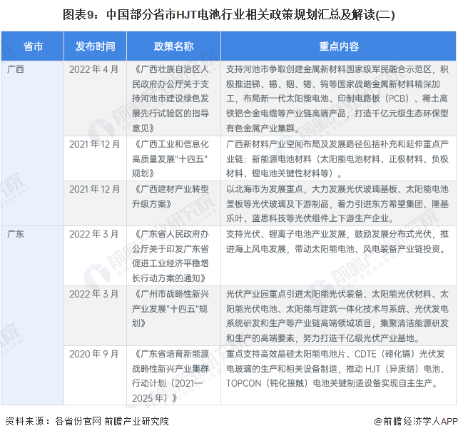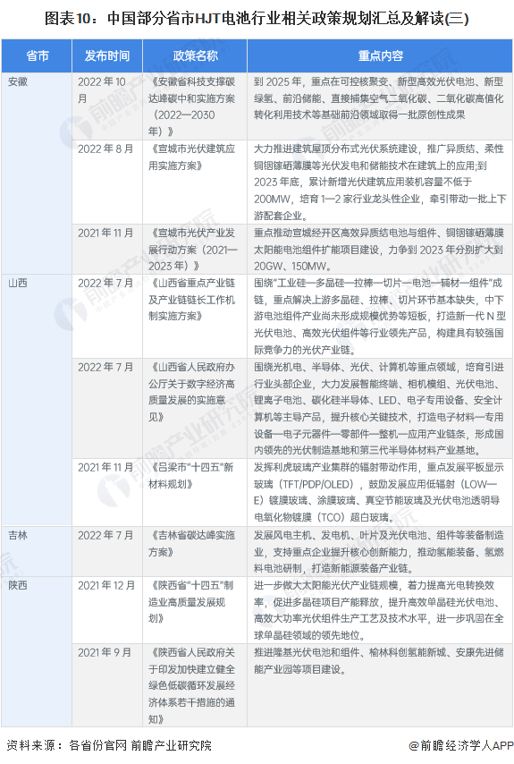 在地方政策方面,截至2022年,江苏、广东、安徽等城市已颁布了多项异质结电池相关的政策。