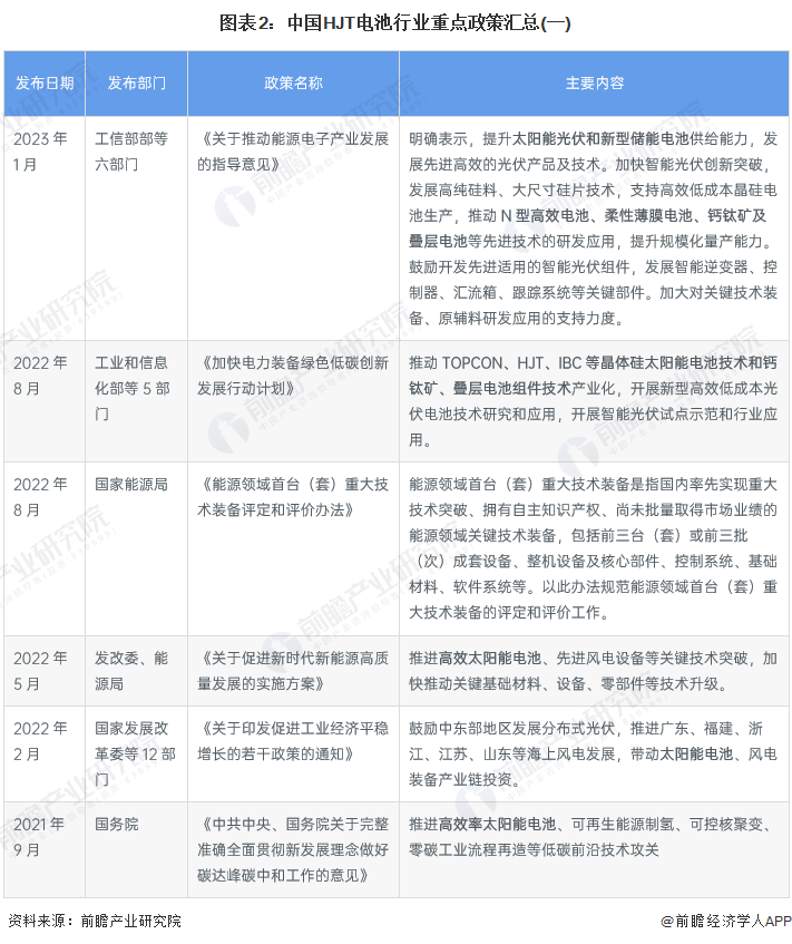 国家层面上,光伏电池产业相关政策较多,且逐渐细化。2022年6月,工业和信息化部等5部门联合发布《加快电力装备绿色低碳创新发展行动计划》,提出要推动TOPCON、HJT、IBC等晶体硅太阳能电池技术和钙钛矿、叠层电池组件技术产业化;2023年1月,工信部部等六部门发布《关于推动能源电子产业发展的指导意见》, 明确表示,提升太阳能光伏和新型储能电池供给能力,发展先进高效的光伏产品及技术。相关政策的提出都将对HJT电池的产业化发展起正向促进左右。