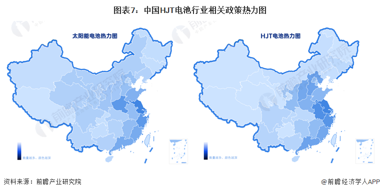 通过对各省市HJT电池行业政策的汇总梳理,并与太阳能电池产业政策热力图对比分析可得:在全国广泛发布太阳能电池相关政策的30个省/市/自治区中,以华北、华东、华南地区为代表,部分省市已开始在政策层面积极布局和规划异质结电池产业发展。
