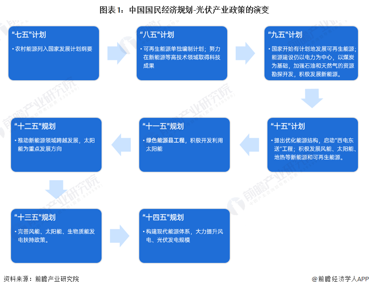 HJT电池行业所属的光伏产业是我国新能源体系构建的重要环节,从“七五”到“十四五”时期,在国家顶层规划中被逐渐细化。“七五”到“九五”期间,我国逐步开始有计划地发展可再生能源;“十五”到“十一五”期间,我国开始启动重点项目,大力发展可再生能源,太阳能是积极发展方向之一;“十二五”至今,我国通过能源生产和利用方式变革,逐步构建现代能源产业体系,目标到2025年非化石能源占能源消费总量比重提高到20%左右,到2030年风电、太阳能发电总装机容量达到12亿千瓦以上。