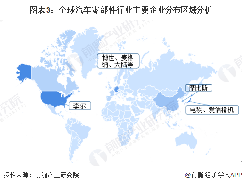 目前全球主要的汽车零部件企业包括博世、电装、采埃孚、麦格纳国际、爱信精机、大陆、现代摩比斯、李尔、法雷奥等,主要集中在美国、芬兰、日本等国家和地区。