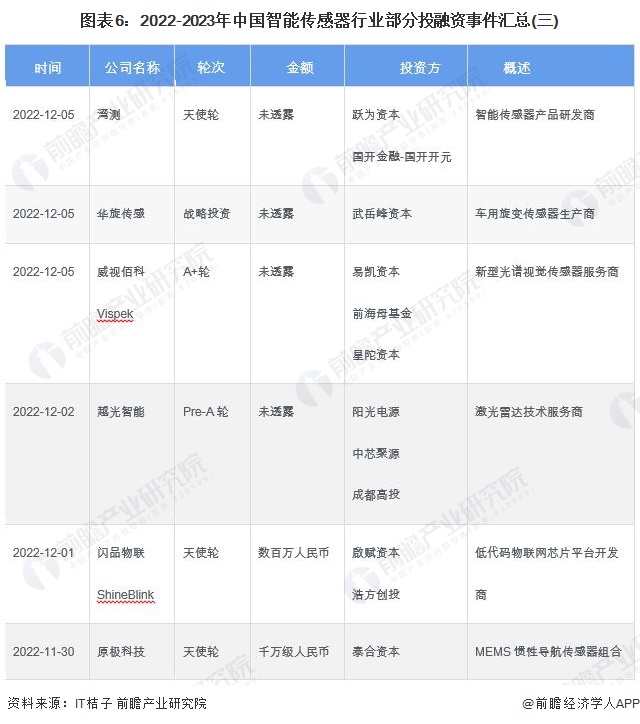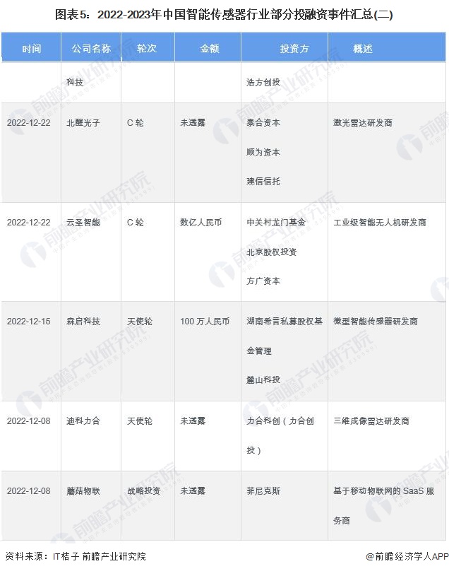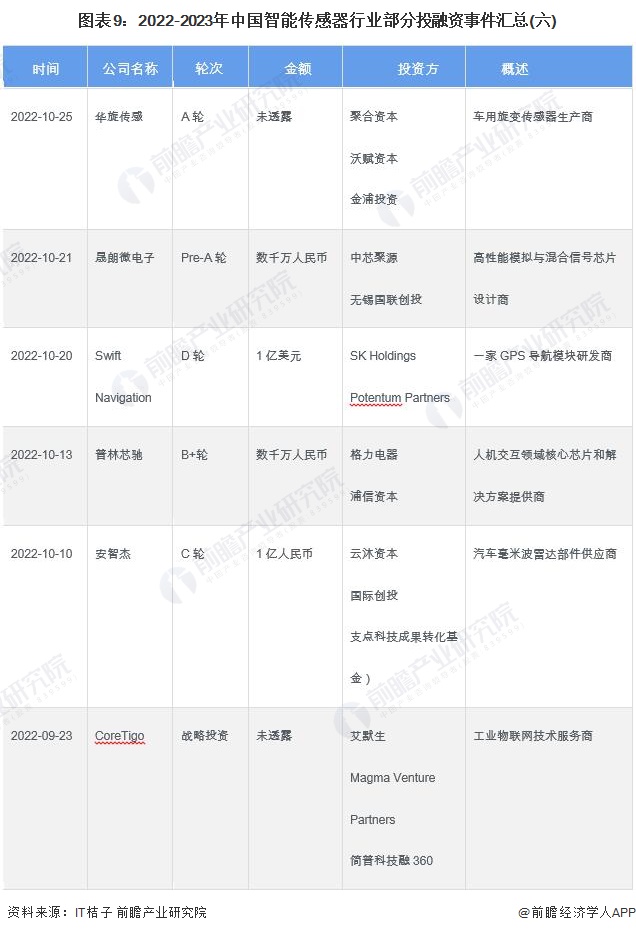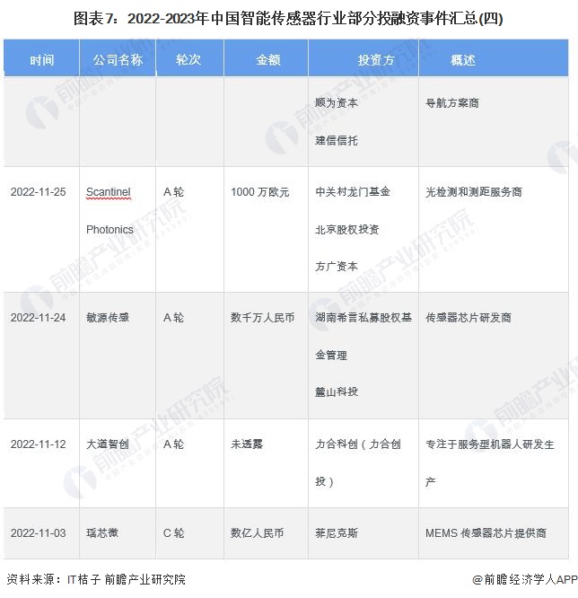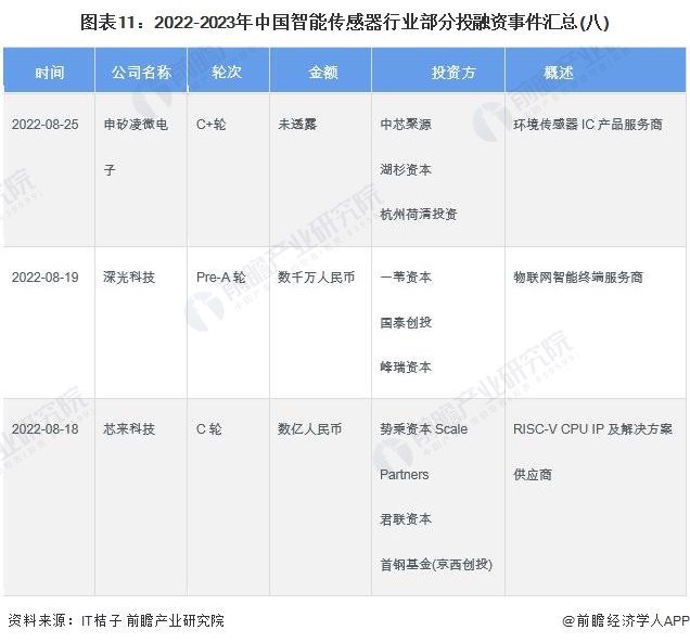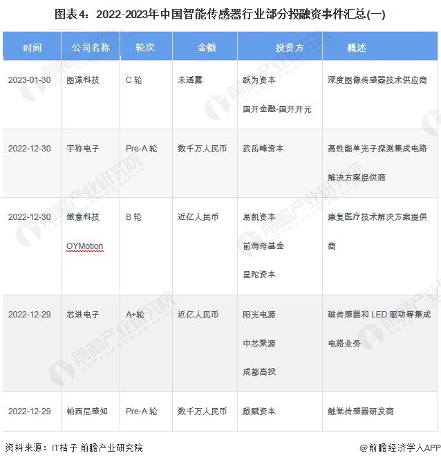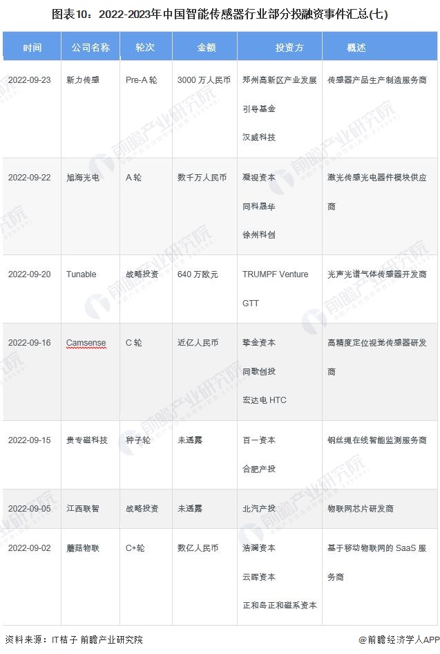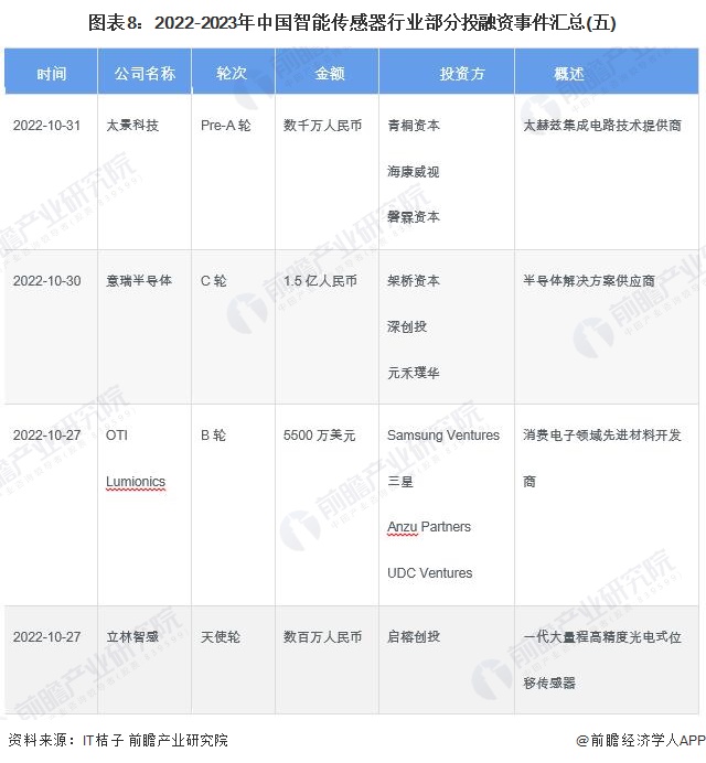 根据IT桔子数据,2010-2023年我国智能传感器行业融资事件数量整体呈现波动上升态势,2017年融资事件数量为172起,为历年来的顶峰;2022年,我国智能传感器行业融资事件数量为115件。总体来看,我国智能传感器行业投融资热度较高。