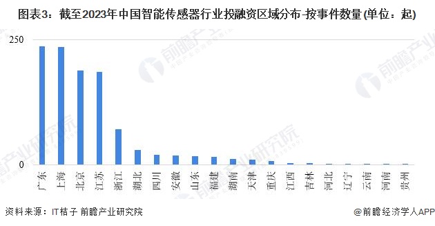 从智能传感器行业的企业融资区域来看,目前广东的融资事件数量最多,截至2023年2月累计达到237起;其次,主要集中在上海地区,截至2023年2月,上海地区投融资时间数量达235起。