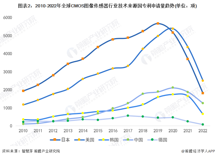 从趋势上看,2019年之前,日本CMOS图像传感器专利申请数量一直领先于全球其他国家,达5673项,而美国屈居第二,申请量达4985项;2020年美国CMOS图像传感器专利申请量当年赶超日本达到5395项,日本则降至5174项,此后,全球CMOS图像传感器申请数量总体开始呈下滑趋势。