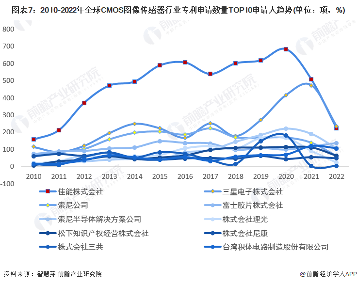 全球CMOS图像传感器行业专利申请数量TOP10申请人分别是佳能株式会社、三星电子株式会社、索尼公司、富士胶片株式会社、索尼半导体解决方案公司、株式会社理光、松下知识产权经营株式会社、株式会社尼康、株式会社三共、台湾积体电路制造股份有限公司。