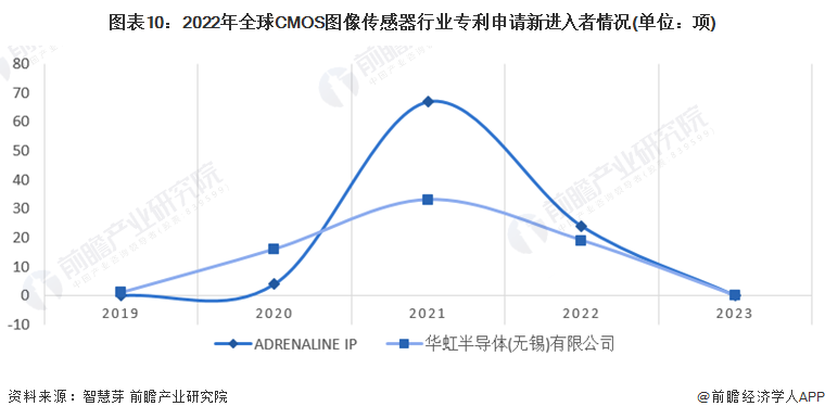 CMOS图像传感器全球新进入者数量较少,仅ADRENALINE IP和华虹半导体(无锡)有限公司两家公司,近5年的申请数量高峰出现在2021年,印证了行业向成熟期过渡的结论。