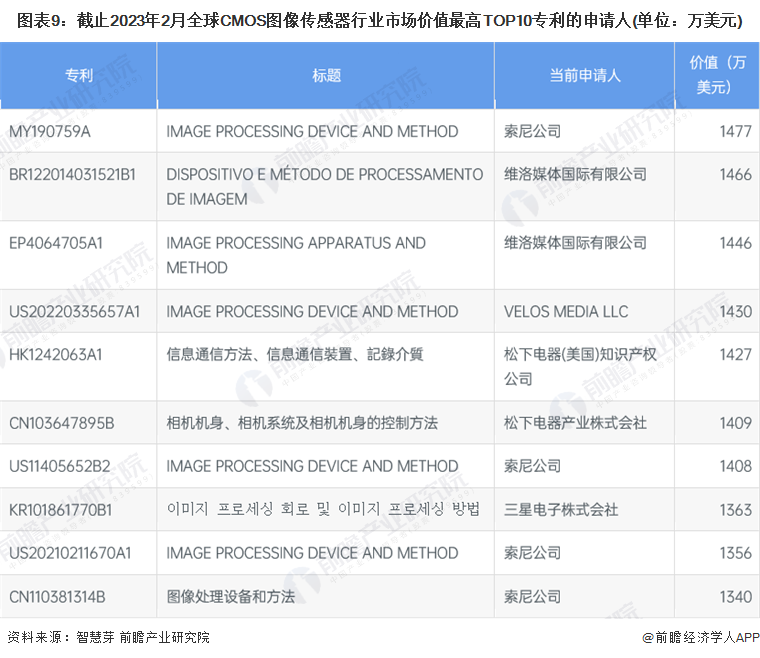 全球CMOS图像传感器市场价值最高TOP10专利中,排名第一的归属索尼公司,价值1477万美元。