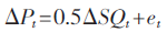 其中,S为有效价差,即买价和卖价之差;Qt为买卖方向,当最后一笔交易为买方发起的交易时,该值取1,当最后一笔交易为卖方发起的交易时,该值取-1。假定Qt取1和-1的概率均为0.5,序列不相关,且独立于et,那么对式(3)取差分,并结合式(2),即可得到式(4):