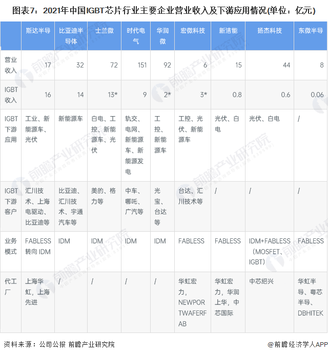 我国IGBT芯片厂商生产模式各有不同,其下游客户及产品应用领域也有所差异。例如,士兰微下游主要市场为白电、工控、新能源车、光伏领域;华润微下游主要应用于工控、新能源车领域;时代电气主要布局轨交、电网、新能源车、新能源发电领域;斯达半导主要开拓工业、新能源车、光伏下游领域;新洁能下游市场为光伏、白电领域;宏微科技主要布局工控、光伏、新能源车领域。