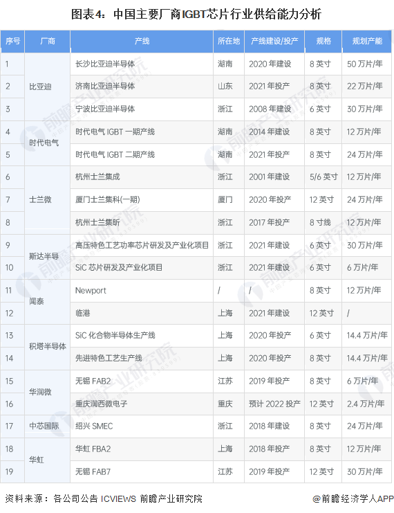 IGBT制造属于资本密集型行业,其产业链较长,包括芯片设计、芯片制造、模块制造、测试等环节;部分设备依赖进口,成本高昂。产品研发阶段亦需要较长研发时间和较高研发成本。近年来斯达半导布局高压特色工艺功率芯片研发及产业化项目;士兰微布局8英寸集成电路芯片生产线项目;比亚迪半导布局济南功率半导体扩产项目;华润微布局8英寸高端传感器和功率半导体建设项目。据不完全统计,国内主要厂商产线布局如下: