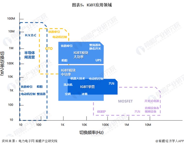IGBT凭借着高功率密度、驱动电路简单以及宽安全工作区等特点,成为了中大功率、中低频率电力电子设备的首选。在工作频率低于10⁵Hz的范围内,硅基IGBT是首选的功率半导体器件,其功率范围涵盖几千瓦至十兆瓦,典型的应用领域包括工业控制(变频器、逆变焊机、不间断电源等);新能源汽车(主电驱、OBC、空调、转向等);新能源发电(光伏逆变器、风电变流器);变频白电(IPM);轨道交通(牵引变流器);智能电网等。