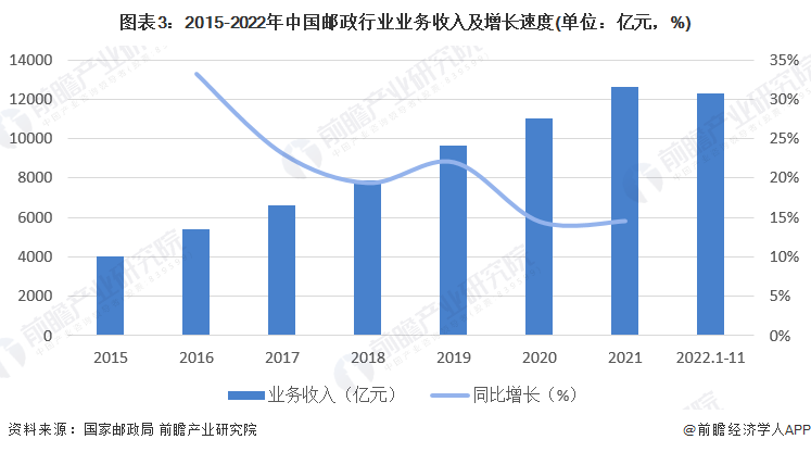 从邮政行业业务收入情况来看,2015-2021年,我国邮政业务收入(不包括邮政储蓄银行直接营业收入)逐年增长。2021年,邮政行业业务收入(不包括邮政储蓄银行直接营业收入)累计完成12642.3亿元,同比增长14.5%;2022年1-11月,邮政行业业务收入(不包括邮政储蓄银行直接营业收入)累计完成12278.7亿元,同比增长5.6%。
