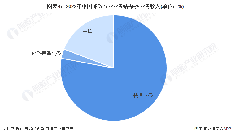 2022年1-11月,邮政行业业务收入累计完成12278.7亿元,其中,快递业务收入累计完成9569.8亿元,同比增长1.6%,占邮政行业业务收入比重为77.94%;邮政寄递服务业务收入累计完成353.4亿元,同比下降1.1%,占邮政行业业务收入比重为2.88%。