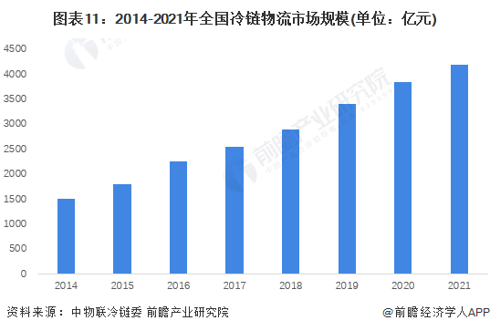 据初步统计,2021年国内生鲜零售市场总额超过5.4万亿元,同比涨幅突破8%,呈稳步增长态势。这些增加的生鲜零售市场规模必然要依靠冷链物流运输,因此带动了我国冷链物流市场规模持续增长。根据中物联冷链委给出的数据,2021年我国冷链物流市场达到9.2%的增速,市场规模达到4184亿元。