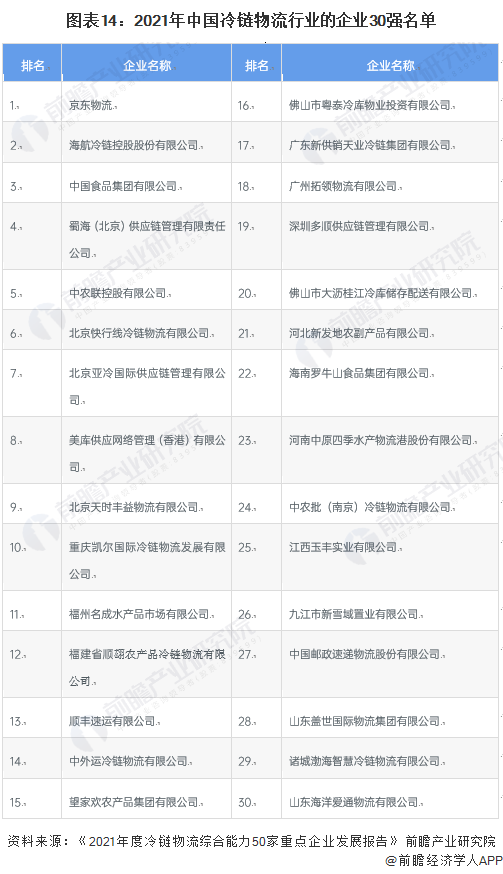在由中冷联盟指导建设的冷链品牌网发布的《2021年度冷链物流综合能力50家重点企业发展报告》中,京东物流、海航冷链以及中国食品集团有限公司位列前三。部分名单如下: