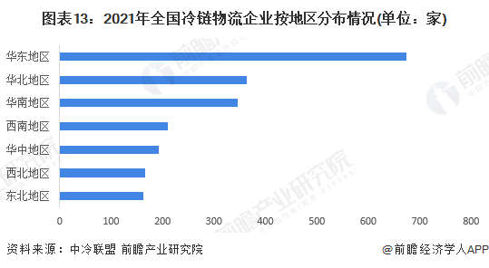 据中冷联盟发布的《全国冷链物流企业分布图》显示,2021年,我国冷链物流企业数量约2116家。按地区来看,华东地区冷链物流企业数量最多,为674家,远多于其他地区。其次是华北地区与华南地区,分别为363家与346家,均多于300家。企业数量最少的为东北地区,为162家。