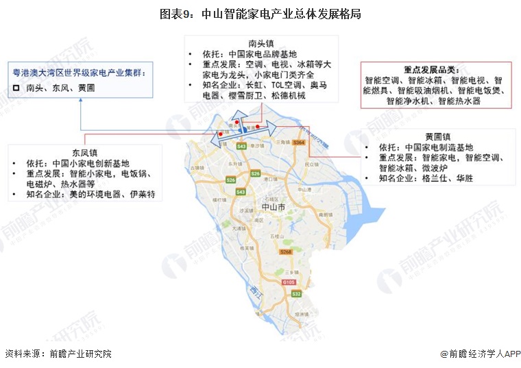 在产业发展格局上,中山主要依托北部南头、黄圃、东凤组成的粤港澳大湾区世界级家电产业集群发展,其中南头镇是中国家电品牌基地、黄圃镇是中国家电制造基地、东凤镇是中国小家电创新基地。在中山家电产业集群中的知名企业包括长虹、TCL、奥马电器、格兰仕、美的环境电器等。未来,中山将依托北部家电产业集群,加强与佛山产业链协作,为家电产业升级及协同发展打造新载体。