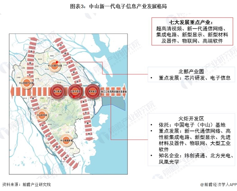 在产业空间布局上,中山市主要依托火炬开发区发展新一代电子信息产业,通过中国电子(中山)基地,重点发展新一代通信网络、高性能集成电路、新型显示、先进材料及器件、物联网、大型工业软件,目前该产业园区已经聚集了纬创资通、北方光电、凤凰光学等一批电子信息产业。