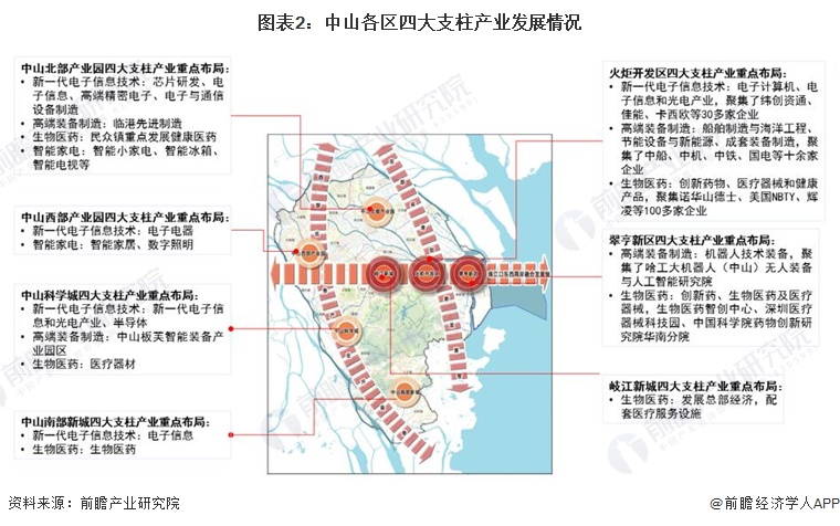 其中,火炬开发区重点布局新一代电子信息技术、高端装备制造、生物医药产业,其中新一代电子信息技术产业主要涉及电子计算机、电子信息和光电产业,聚集了纬创资通、佳能、卡西欧等30多家企业,高端装备制造聚焦于船舶制造与海洋工程、节能设备与新能源、成套装备制造,聚集了中船、中机、中铁、国电等十余家企业。翠亨新区则重点布局生物医药与健康产业、高端装备制造,其中高端装备制造聚集了聚集了哈工大机器人(中山)无人装备与人工智能研究院双创基地。中山其它区域四大支柱产业重点细分子产业发展情况如下: