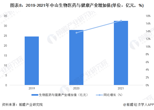 2019-2021年,中山生物医药与健康产业增加值逐年增长,2021年中山生物医药与健康产业产业增加值为32.51亿元,同比增长16.8%。