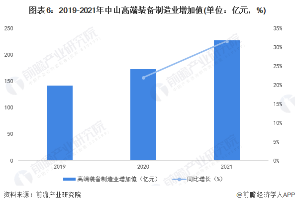 2019-2021年,中山高端装备制造业增加值逐年增长,年增速高达20%以上,2021年中山高端装备制造业增加值为227.21亿元,同比增长31.5%。