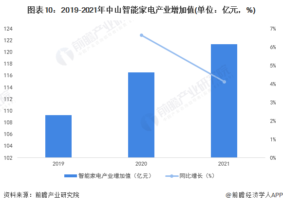 2019-2021年,中山金融业增加值呈现持续增长的态势,但是增速有所下滑。2021年,中山智能家电产业增加值达到121.3亿元,同比下降4.1%。目前来看,中山市智能家电产业仍处于增长的趋势,但产业增速放缓也对中山智能家电产业转型升级提出更迫切的要求。