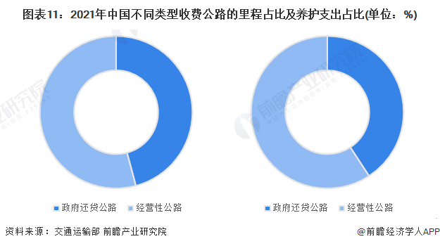 根据不同的经营模式,收费公路又可分为政府还贷公路(指县级以上地方人民政府交通运输主管部门利用贷款或者向企业、个人有偿集资建设的公路,以及使用地方政府收费公路专项债券建设的公路)和经营性公路(指国内外经济组织投资建设或者依照公路法的规定受让政府还贷公路收费权的公路)。其中,经营性公路的里程占比超过54%,其养护支出占比接近60%,整体反映出经营性公路的养护投入水平要高于政府还贷公路。