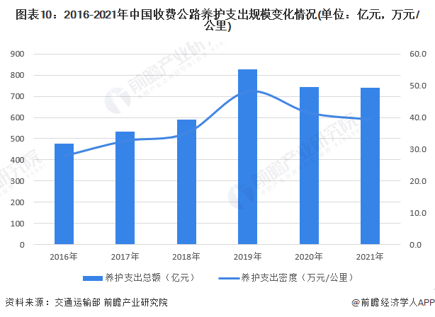 根据交通运输部数据,2021年,全国收费公路里程18.76万公里,养护支出规模超过700亿元,养护支出密度超过39万元/公里。